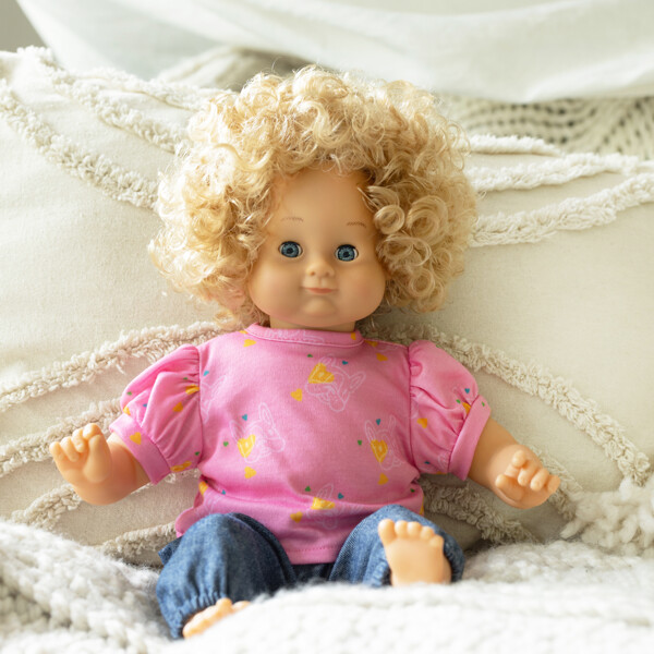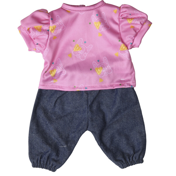 Settiin kuuluu farkut ja t-paita. Nukkevaatteet on helppo pukea ja riisua vaihtoja ja uusia seikkailuja varten. Mitä nukke ja lapsi keksivät tänään? Anna lapsen mielikuvituksen näyttää tietä!