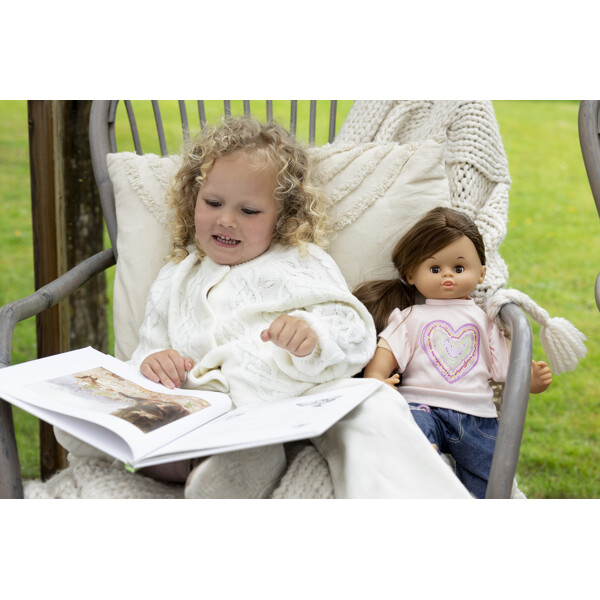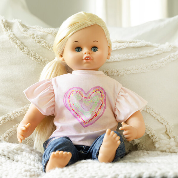Settiin kuuluu farkut, t-paita. Nukkevaatteet on helppo pukea ja riisua vaihtoja ja uusia seikkailuja varten. Mitä nukke ja lapsi keksivät tänään? Anna lapsen mielikuvituksen näyttää tietä!