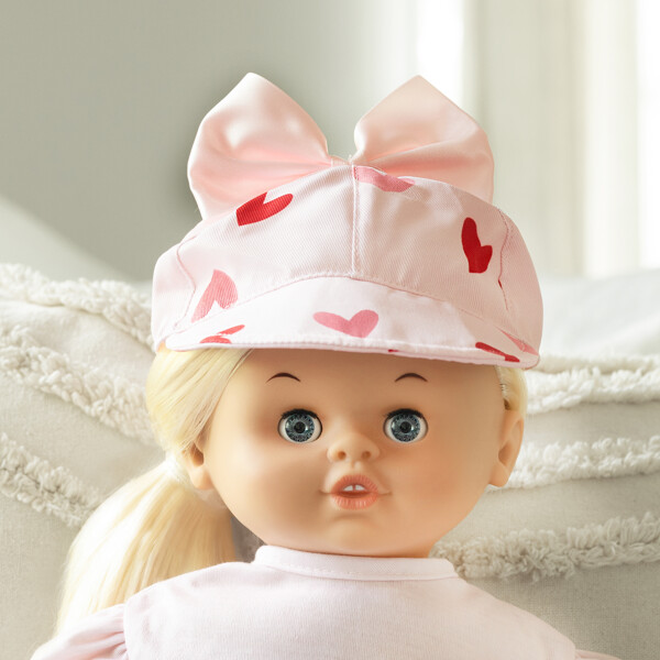 Lippalakki rusetilla iloisissa, leikkisissä väreissä ja sopii nukeille, joiden koko on 41-46 cm.
