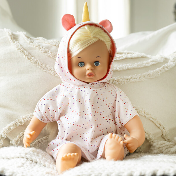 Kylpytakissa on hienoja, ommeltuja yksityiskohtia yksisarvisen sarvella. Nukkevaatteet on helppo pukea ja riisua vaihtoja ja uusia seikkailuja varten. Mitä nukke ja lapsi keksivät tänään? Anna lapsen mielikuvituksen näyttää tietä!