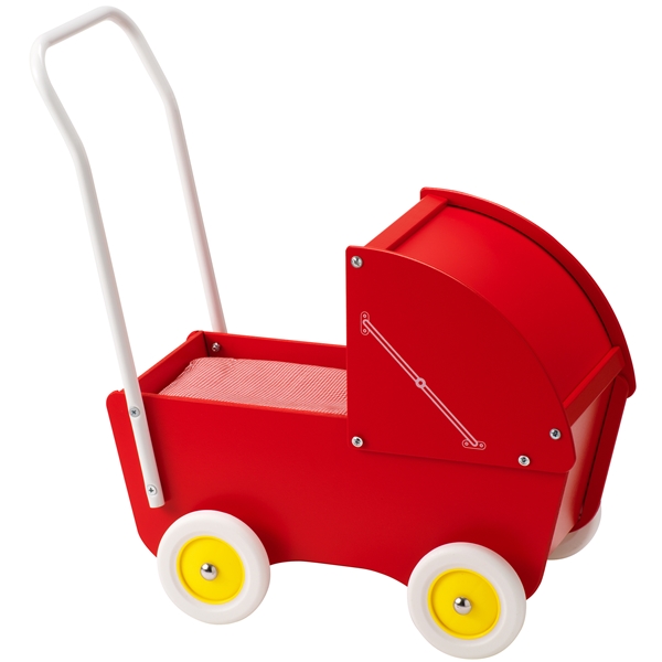 Kuomuvaunu, punainen on klassinen puinen nukenvaunu kuomulla. Se sopii pienille nukeille tai pehmoeläimille. Jos haluat vaunuista erityisen viihtyisät, voit varustaa ne niille tarkoitetulla lakanasetillä!