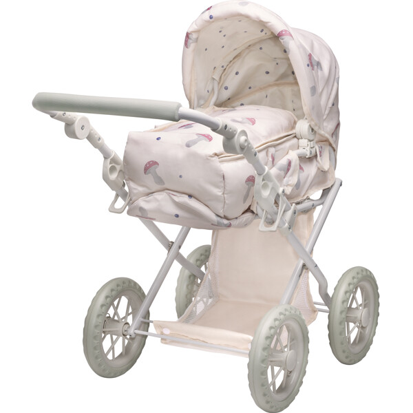 Nukenvaunuissa on irrotettava, pehmeä kantokoppa kahvoilla. Vaunujen kahva on säädettävä, joten se sopii eri-ikäisille ja -pituisille lapsille. Vaaleanpunainen verhoilu on irrotettava ja koristeltu käsin piirretyillä mustikoiden ja sienien kuvilla - ainutlaatuinen Ruotsissa luotu design. Siinä on myös taitettava kuomu, käytännöllinen ostoskori ja runko, joka voidaan taittaa kokoon kuljetuksen ajaksi.
