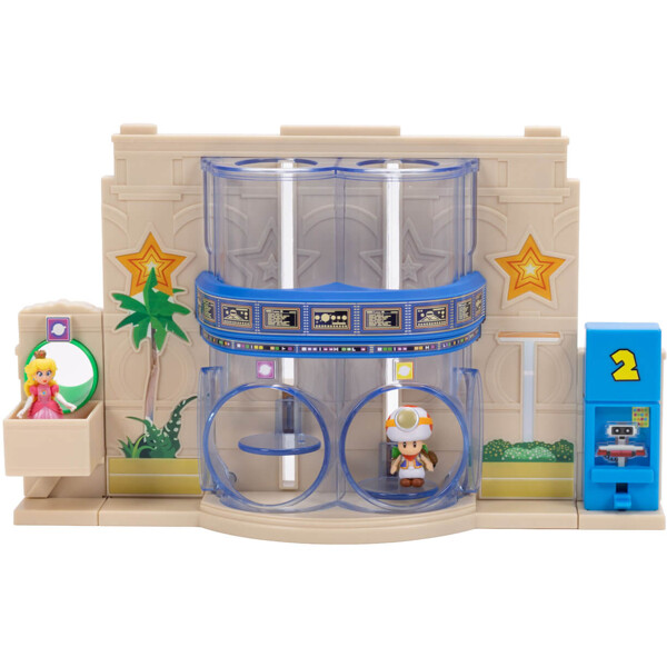 Elokuvaan perustuvassa dioraamakohtauksessa on alustoja, joissa hahmot voivat liikkua ylös ja alas siirtoputkissa, warp-putki, jonka läpi voi liukua, sekä paneeli, jossa R.O.B. tärisee. Aloita tutkiminen mukana tulevilla 3,8 cm Princess Peach- ja eksklusiivisilla Captain Toad -hahmoilla. Tervetuloa galaksiin!