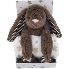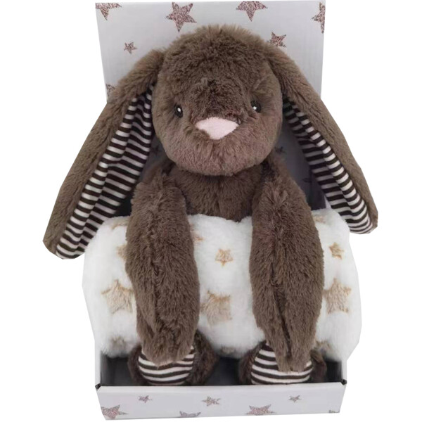 Setti, jossa on pehmeä, ihana fleecepeitto ja söpö pehmolelu kanin muodossa.