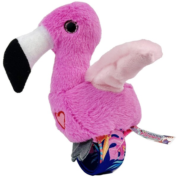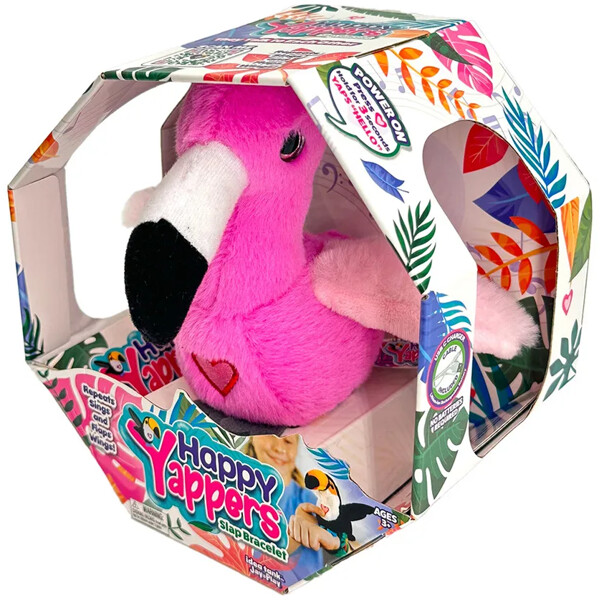 Happy Yappers puhuva pehmolelu on kiinnitetty slap-rannekkeeseen, joka mahdollistaa pehmolelun istumisen käsivarrellesi. Puhuva lintu laulaa, visertää, toistaa sanasi ja räpyttelee siipiään.