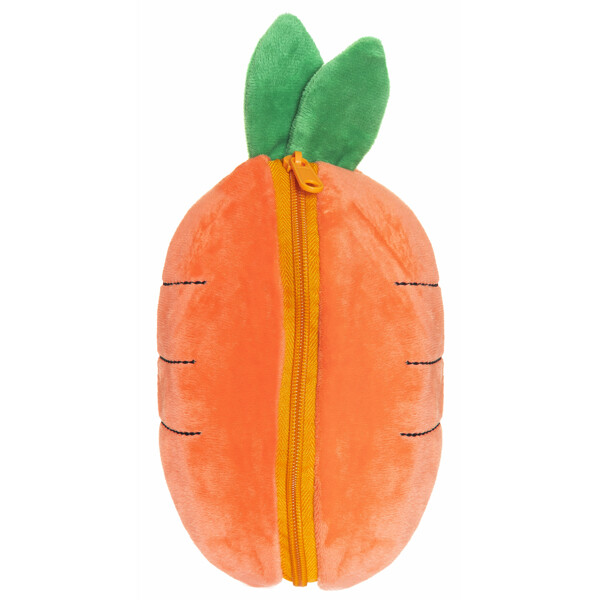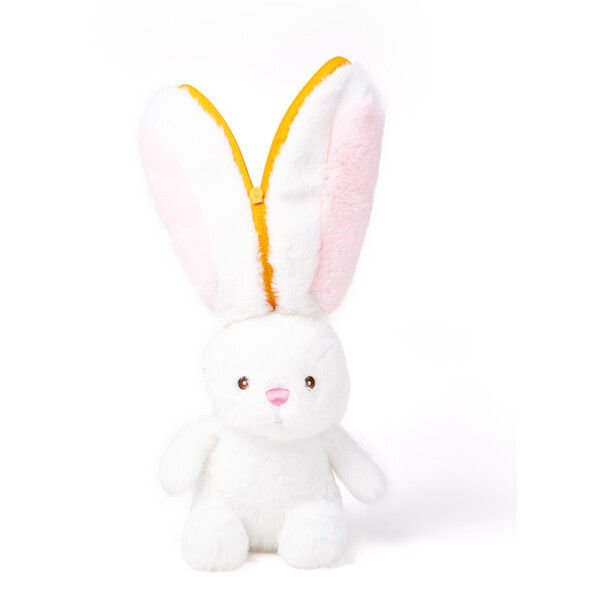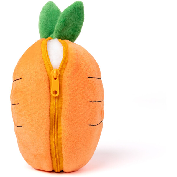 Valkoinen kaniini, joka piiloutuu vetoketjulla suljettavaan porkkanaan, ja koko kaniini mahtuu porkkanan sisään, kun se on suljettu.