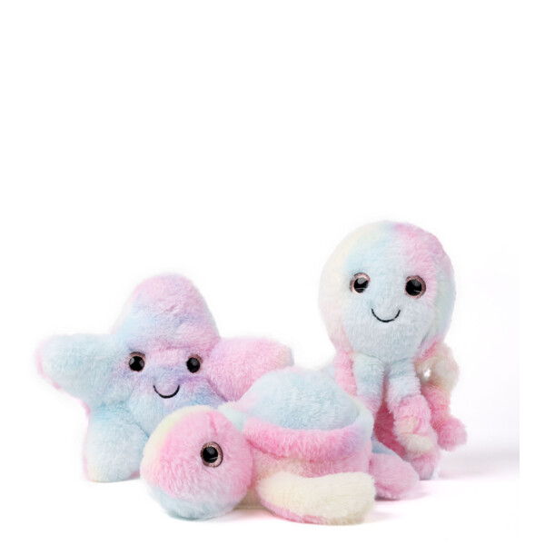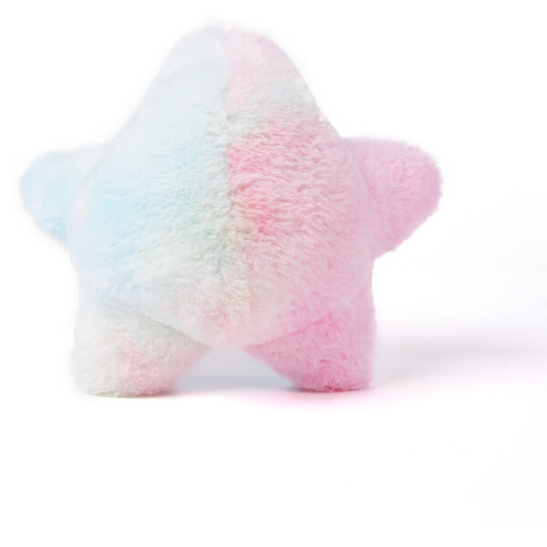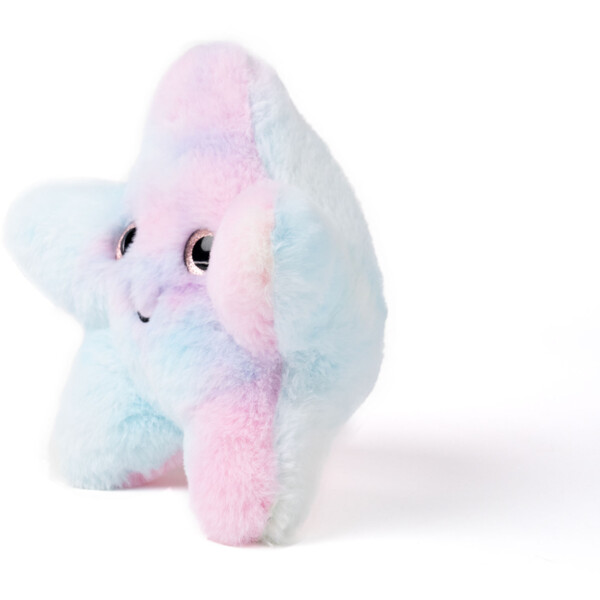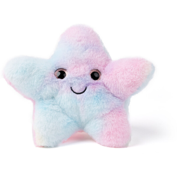 Pehmeä meritähti pastellinvärisissä sateenkaaren väreissä: vaaleanpunainen, sininen ja keltainen.
