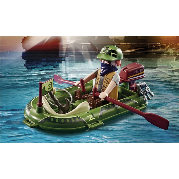 Rohkea PLAYMOBIL-poliisi pitää yllä myös järjestystä ilmassa. Yksi roisto on pakomatkalla salakuljettavin tavaroin. Varas koittaa paeta kumiveneellä. Neuvokas pilotti pitää häntä silmällä ohjaamostaan eikä päästä häntä pakenemaan. Hän laskeutuu taitavasti lentokoneellaan järveen ja roisto jää kiinni. Polisi laittaa hänet käsirautoihin ja ohjaa roiston lentokoneeseen ja vie poliisiasemalle.Leikkisetti sisältää kaksi PLAYMOBIL-hahmoa, yhden vesilentokoneen, yhden veneen, pilottikypärän, baskerin, käsiraudat ja monia muita lisävarusteita jännittävään poliisiseikkailuun. Lentokone voi nousta ja propelli pyörii.