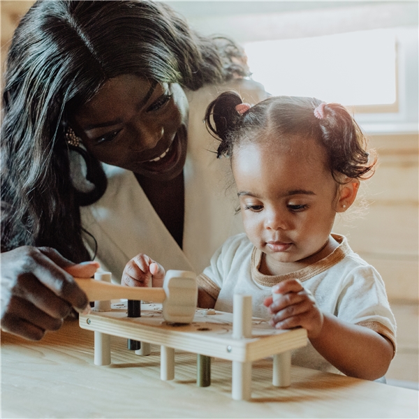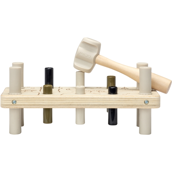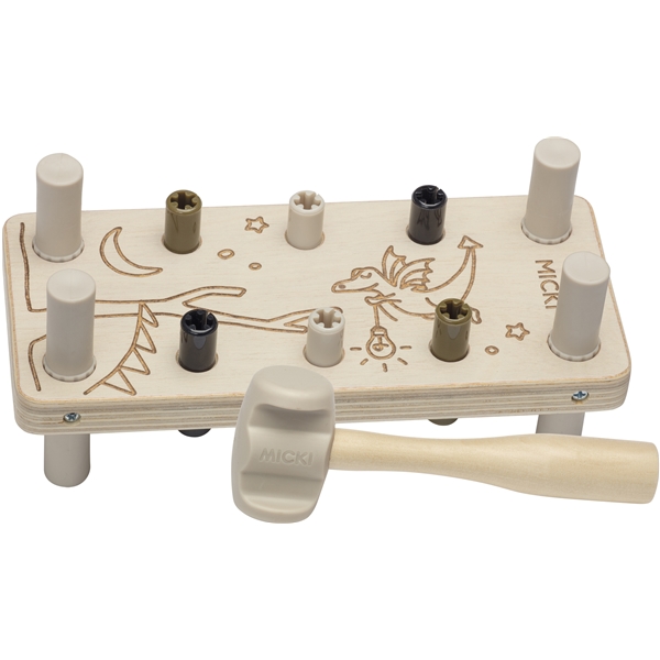 Mickin suosittu hakkalelu, joka on vähän hienompi! ! Alkuperäisessä puisessa premium-lelussa on kaiverretut yksityiskohdat ja leikkisät kuvioinnit laatikon ulkosivuilla. Jalat ja vasaran pää ovat pehmeää muovia, minkä ansiosta se on vakaa eikä jätä jälkiä alustaan lapsen hakatessa. Miltä kuulostaa, kun naulat vasaroidaan alas? Aloita tuntien hauska hakkaaminen!