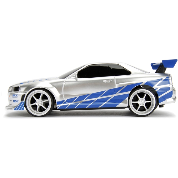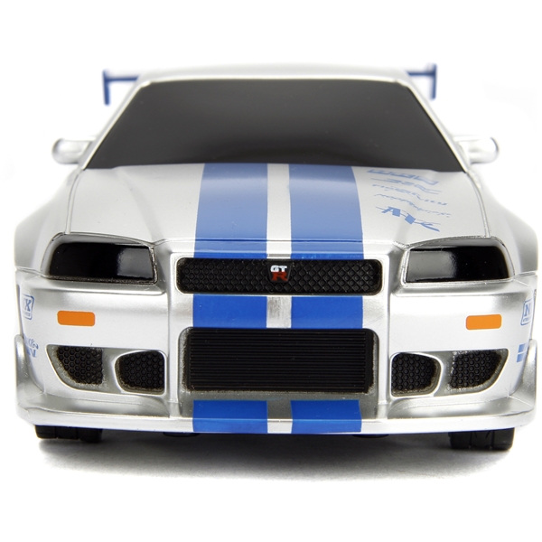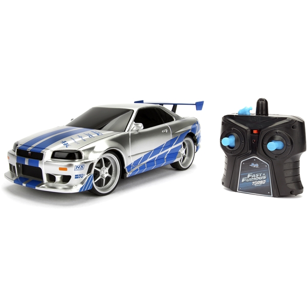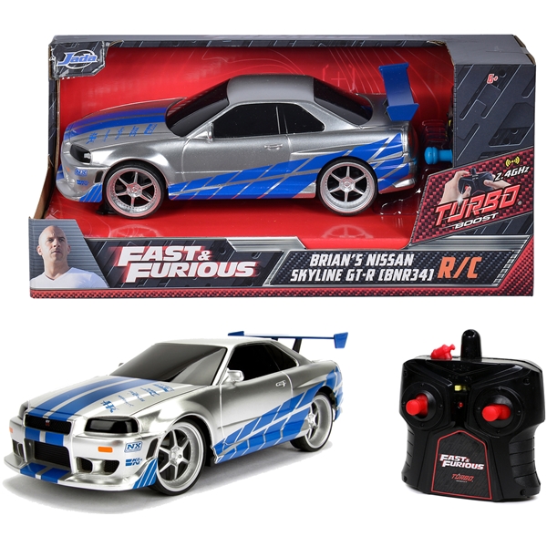 Fast & Furious RC Nissan Skyline GTR 1:24 on huikea auto Fast & Furious -elokuvasta. Tämä auto on rakennettu nopeuteen ja sen suorana esikuvana on ollut Brians Nissan Skyline GTR. Kokeile painaa turbopainiketta ja kilpa-ajaa maaliin nähdäksesi kuka tulee ensin. Tämän mahtavan auton mittakaava on 1:24 ja se on radio-ohjattava helpoin aero-modifioinnein, suorituskykyisin renkain ja sen maksiminopeus on 8 km/h. Tämä radio-ohjattava auto pystyy ajamaan eteenpäin/taaksepäin ja oikealle/vasemmalle.