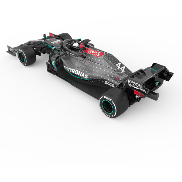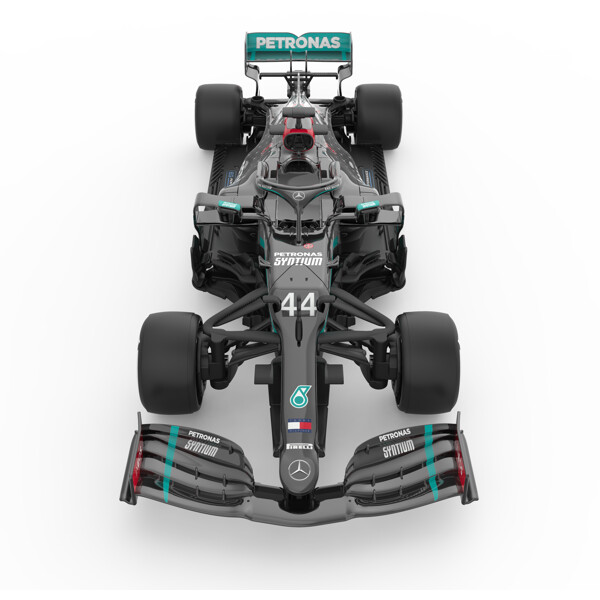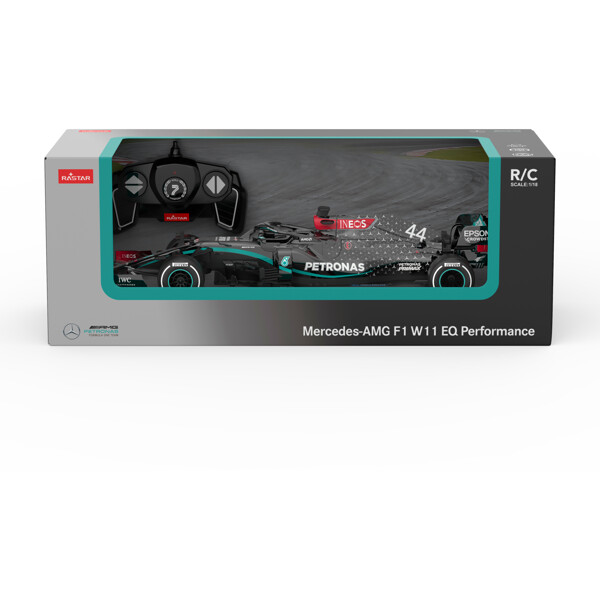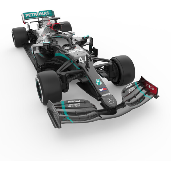 Tämä radio-ohjattava Mercedes AMF F1 W11 EQ Performance -auto on autenttisesti muotoiltu, siinä on valettu kori ja itsenäinen jousitusjärjestelmä.