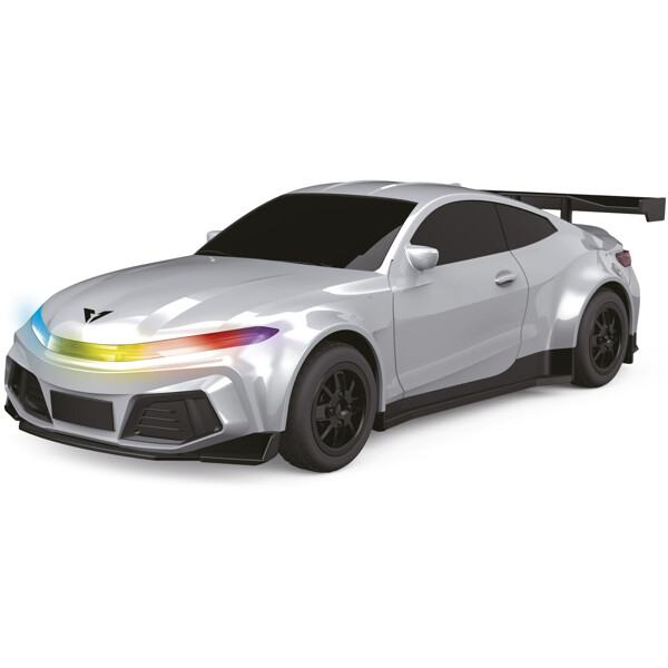 Upea urheiluauto, jossa on paljon siistejä ominaisuuksia: Lataa auto latausasemalla kuten oikea sähköauto tai USB-kaapelin kautta, erilaisia valo- ja ääniefektejä, pysäköintitoiminto ja musiikin vaihto autossa.