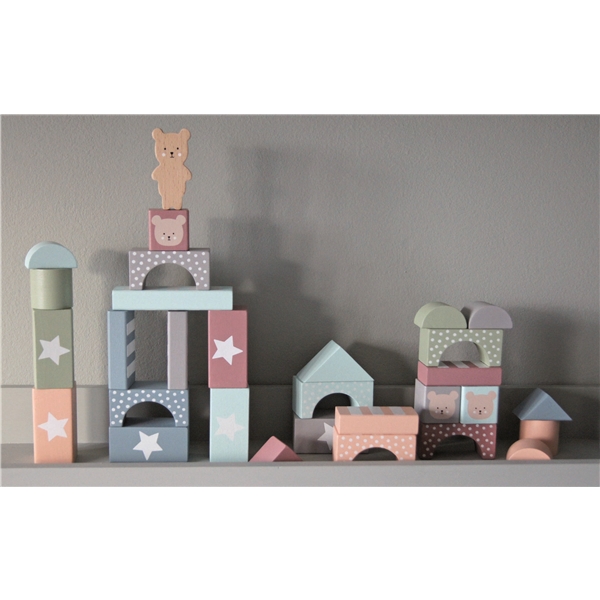 JaBaDaBaDo rakennuspalikat Teddy sisältää 49 palikkaa eri väreissä ja muodoissa. Lapsi voi pinota korkean tornin, rakentaa linnan tai mitä vaan mielikuvitus tuottaa. Palikoilla leikkiminen antaa lapselle iloa pitkäksi aikaa ja se on takuuvarma syntymäpäivälahja. Palikat ovat sekä viihdyttäviä että kehittäviä, lapsi oppii koordinaatiota ja sormivalmiutta. Rakenteluleikki voi kestää tunteja ja luovat mahdollisuudet ovat rajattomat. Palikat toimitetaan käytännöllisessä kangaspussissa.