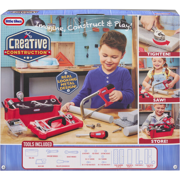 Pakkaus sisältää 10 realistista työkalunosaa, mukaan lukien saha, jakoavain, hylsyavainsarja ja työkalupakki säilytystä varten. Lisäksi mukana on vaahtomuovipaloja, jotka näyttävät metallilta, eri muodoissa, joita lapset voivat ruuvata ja sahata - ilman sotkua. Mukana tulee opas, jossa on helppotajuiset ohjeet.