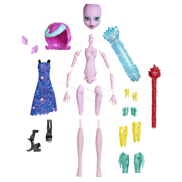 Pakkaus sisältää kaikki kehoon tarvittavat osat (kädet, jalat, kehon, käsivarret, pään, korvat), vaatteita, asusteita, piirtokynän, jääkynän, peruukin. Yli 6-v.
