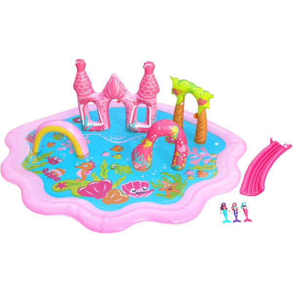Käy merenneitolinnassa, leiki laguunissa, liu'u alas liukumäkeä tai tanssi sateenkaaren alla. Täällä odottavat aina uudet seikkailut - täydellinen yhdistelmä luovaa leikkiä, vettä ja auringonpaistetta. Paketti sisältää 3 merenneitonukkea (13 cm) sekä suuren leikkimaton, jonka koko on 160 × 137 × 51 cm. Puhalla eri osat täyteen ilmaa, kiinnitä liukumäki mattoon mukana tulevilla teippiliuskoilla ja liitä puutarhaletku maton reunaan. Kun avaat vesihanan, vettä suihkuaa sivuilta ja koko leikkialue pysyy ihanasti märkänä.