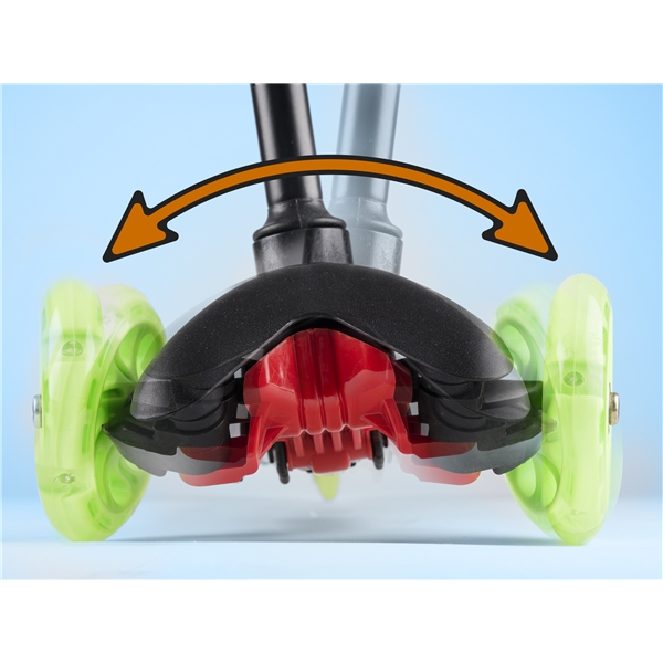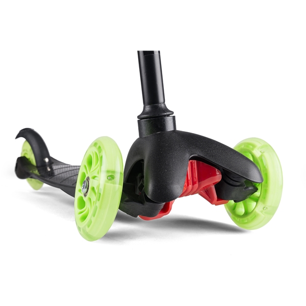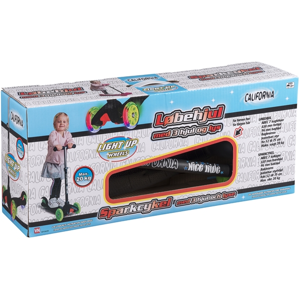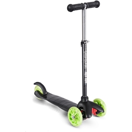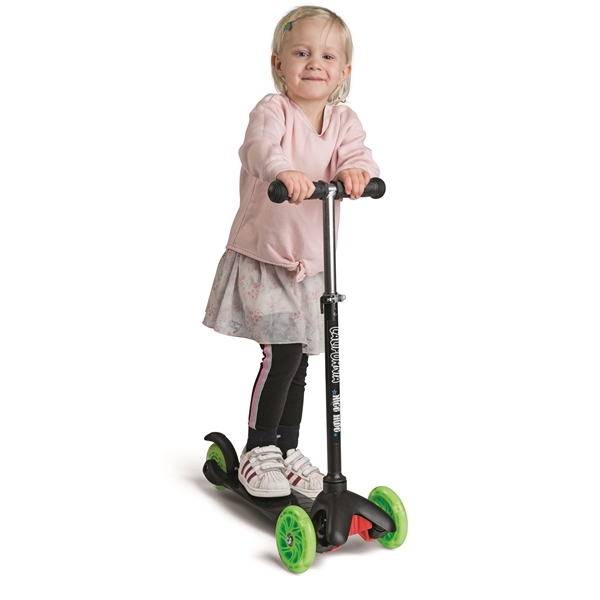 California Potkulauta Musta 3 Pyörää on musta polkupyörä huikean vihreällä koristelulla. Potkulaudassa on 3 pyörää ja se antaa lapselle tukevamman ajon. Etupyörän koko on 110 mm ja takapyörien 96 mm. Potkupyörässä on takajarru, jonka lapsi voi helposti laittaa päälle painamalla kevyesti kantapäällä. Ohjauksen korkeus on säädettävissä välille 52-75 cm lapsen pituuden mukaan. Sen maksimikanto on 20 kg.