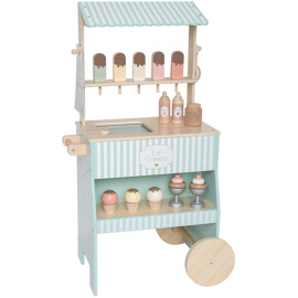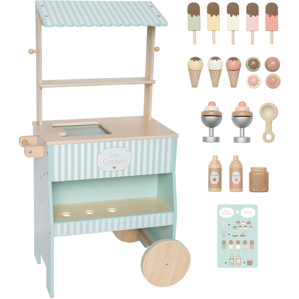 Tämä viehättävä jäätelövaunu klassisessa sinivalkoraidallisessa designissa kutsuu tuntikausien mielikuvitukselliseen leikkiin. Täällä lapset voivat tarjoilla ihania jäätelöitä kaikissa mahdollisissa mauissa – sekä tikkuna että tötterössä!