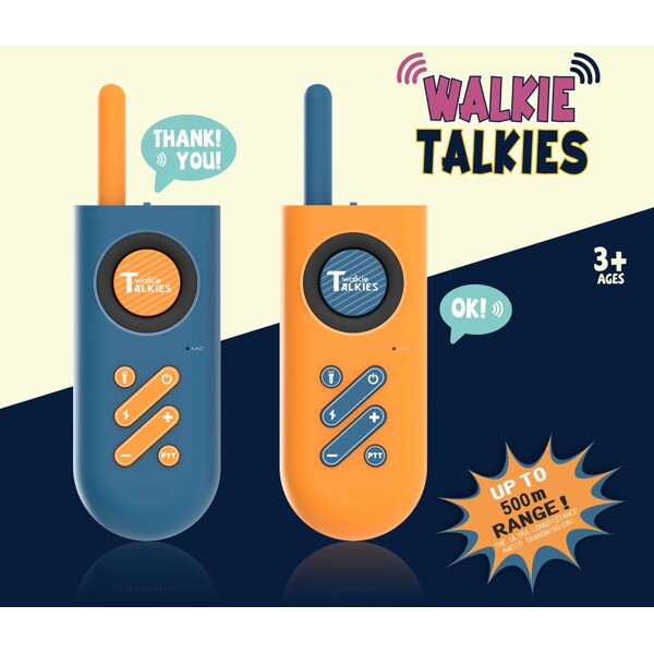 Kaksi eriväristä lähetintä sisältävät Walkie-Talkiet. Kantama jopa 500 m.