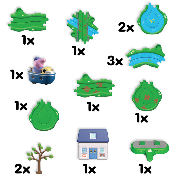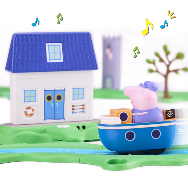 Peppa Pig Whizz-Around on kauniisti yksityiskohtainen ja värikäs sarja rata- ja ajoneuvoleluja, jotka herättävät Peppa Pigin maailman eloon aivan uudella tavalla!Peppa Pig Whizz-Around Bobbing Along Boat Set sisältää Isoisä Pigin Bobbin’ Along -veneen, tieosuuksia, joki-osuuksia, tarvikkeita ja venetalon liikkeenohjatuilla äänitehosteilla! Rataosuudet yhdistyvät yksinkertaisella palapelijärjestelmällä, joka on täydellinen pienten käsien koottavaksi. Mukauta rataa tarvikkeilla. Paina sitten Isoisä Pigin päätä ja katso hänen menevän! Kun vene ohittaa venetalon, kuulet melodioita, lauseita ja äänitehosteita!Peppa Pig Whizz-Aroundin maailma kannustaa mielikuvitukselliseen leikkiin ja kehittää hienomotoriikkaa sekä käsi-silmä-koordinaatiota. Rakenna oma Peppa Whizz-Around -maailmasi ja luo hauskoja seikkailuja Peppalle ja hänen ystävilleen.Sisältää:2 x Tieosuus3 x Joki-osuus1 x Risteysosuus2 x Jokimutka2 x Tiemutka1 x Tuulinen linna2 x Puu1 x Isoisä Pigin vene1 x Venetalo1 x Elektroninen alusta4 x AAA-paristoa tarvitaan (ei sisälly)