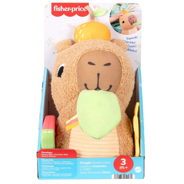 Suloinen, pehmoinen ja leikkisä kapybara Fisher-Pricelta sisältää runsaasti aistimuksellisia yksityiskohtia, joita lapsi voi tutkia. Kirkkaat värit, teksturoitu kangas ja hauskat äänet sekä omat "välipalat" aktivoivat lapsen aisteja leikin aikana.