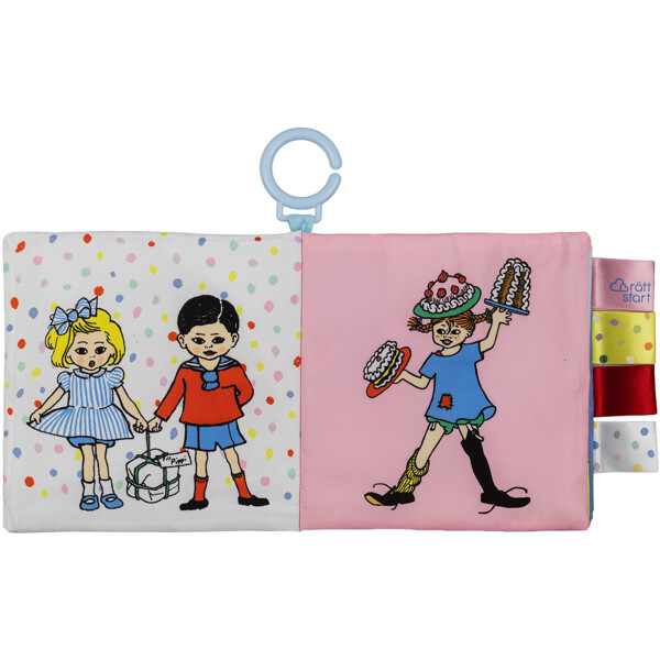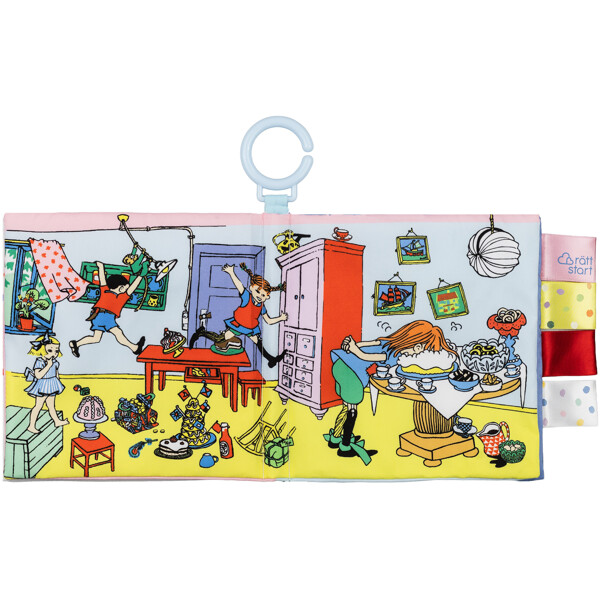 Leikkisä rapinakirja, jossa on kuvia Peppi Pitkätossusta ja hänen talostaan Huvikummusta.