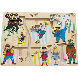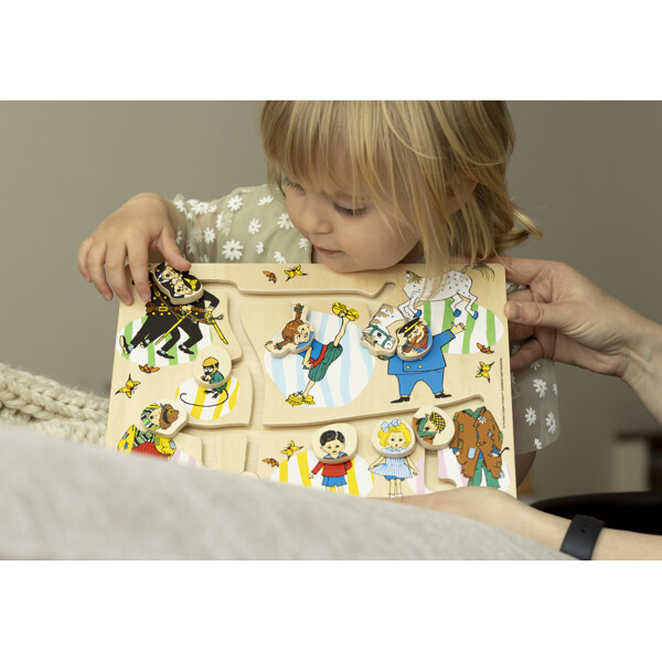 Tässä sinun tulee siirtää yhdeksää erilaista pääpalikkaa radalla ja löytää oikea vartalo. Mutta ei haittaa, jos menee pieleen, on vähintään yhtä hauskaa luoda hassuja hahmoja ja keksiä omia versioita. Palapeli on puuta ja tarjoaa leikkisää ajattelua, naurua ja luovuutta. Täydellinen palapeli pienemmille lapsille, jotka tykkäävät kokeilla, yhdistellä ja löytää uusia tapoja leikkiä yhdessä.