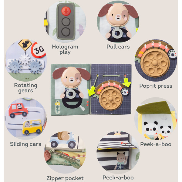 Tee automatkasta jännittävä seikkailu lapsellesi!Taf Toys Quiet Ride Book -kirjan avulla jokaisesta matkasta tulee leikin ja oppimisen hetki. Tämä älykäs aktiviteettikirja on täydellinen 1–3-vuotiaille lapsille ja kiinnittyy helposti ja turvallisesti auton niskatukeen.Kirja on täynnä hauskoja yllätyksiä, erilaisia tekstuureja tunnusteltavaksi, rapisevia kankaita, silikonisia pop-it-leluja, kurkistusläppiä ja pieniä siirrettäviä autoja – kaikki käänteisissä istuimissa istuvien lasten ulottuvilla.Montessori-pedagogiikasta inspiroituneena se kannustaa ruudutonta viihdettä ja stimuloi lapsen uteliaisuutta ja kehitystä. Vältä kitisevät automatkat ja luo sen sijaan rauhallisia, keskittyneitä hetkiä, jotka ovat täynnä löytämisen iloa!