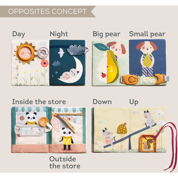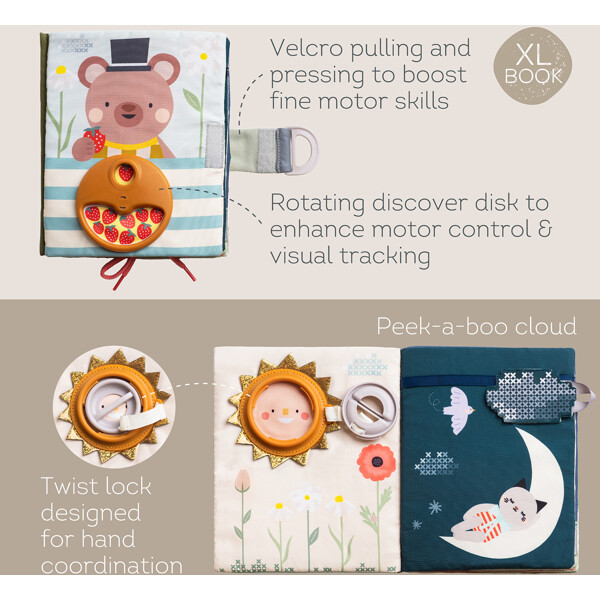 Leikkisä ja kekseliäs pehmeä kirja, joka on suunniteltu 18 kuukauden ikäisille ja sitä vanhemmille lapsille. Kirjassa on kaksitoista erilaista aktiviteettia, kuten vetoketjut, soljet, nauhat ja kurkistusleikit, jotka parantavat motoristen taitojen kehitystä ja esittelevät taitoja, kuten pukeutumista ja kiinnittämistä.Kirjassa on myös numeroita varhaisten matemaattisten taitojen edistämiseksi. Valmistettu turvallisista ja kestävistä materiaaleista.