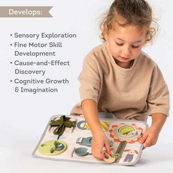 Interaktiivinen lelu, joka auttaa lasta harjoittelemaan motoriikkaa ja tutkimaan äänireaktioita. Lelussa on naruja, jotta lapsi voi oppia solmimaan, pyörivä levy kurkistus-kukalla, orava ja kääntölukko.