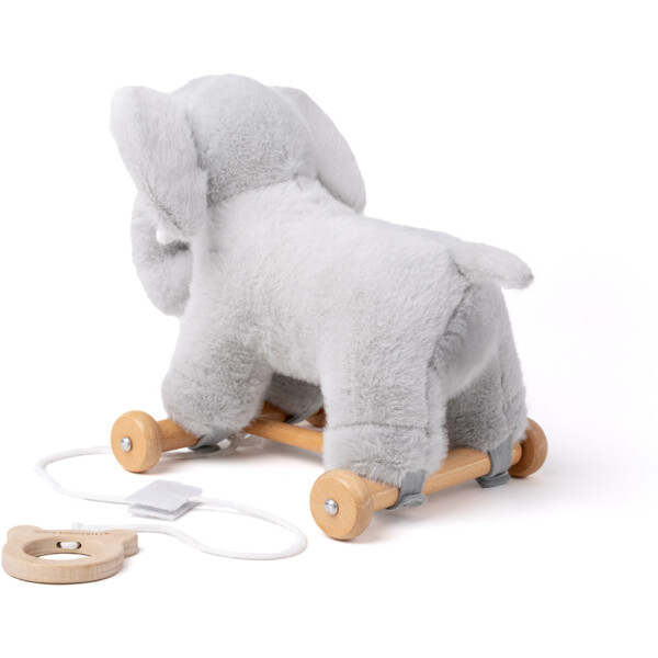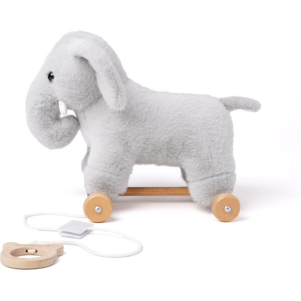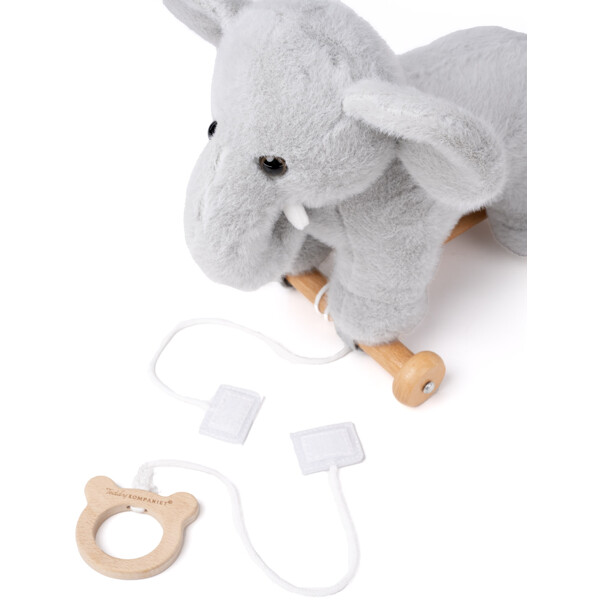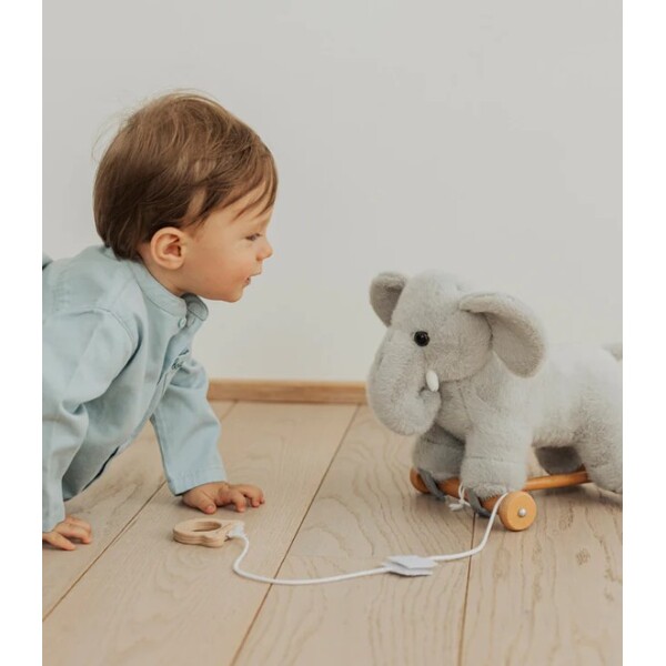 Elefantti istuu tukevasti vakaalla puupohjalla, joka voidaan helposti irrottaa, kun halutaan leikkiä sen kanssa tavallisena pehmoleluna. Yhdistelmä vedettävää lelua ja pehmolelua tarjoaa monia leikkimahdollisuuksia, sekä rauhallisesti että liikkeessä.