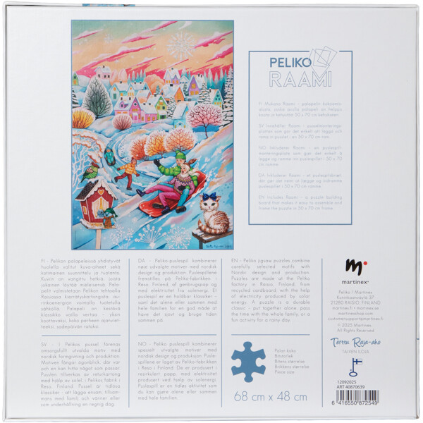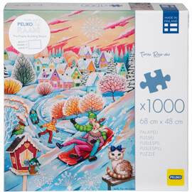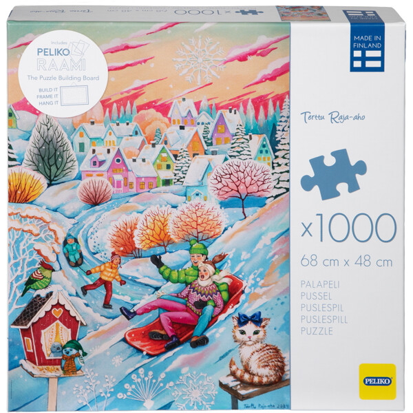 1000 palan palapeli, jossa on vauhdikas, hauska ja yksityiskohtainen aihe talven viileämmissä sävyissä, luotu suomalaisen taiteilijan Terttu Raja-ahon toimesta. Talven iloa sekä eläimille että ihmisille, maan ollessa peitettynä kimaltelevalla lumella.