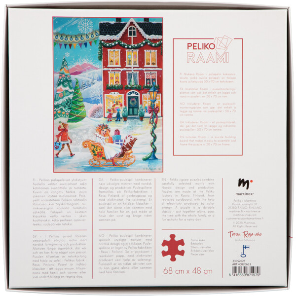 Sisältää Peliko Raamin, palapelikoontilevyn, joka helpottaa palapelin kokoamista ja kehystämistä standardikokoiseen 50 x 70 cm kehykseen.