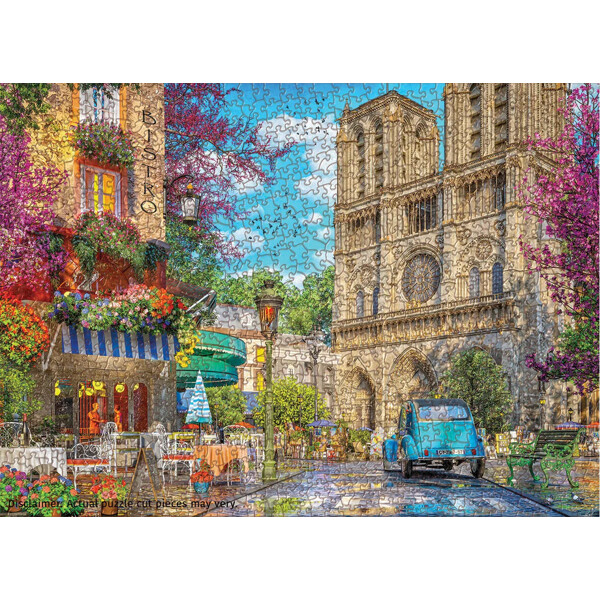 Nauti pariisilaisesta elämänilosta. Dominic Davison on maalannut aurinkoisen iltapäivän Notre-Damen katedraalin vieressä: kahvilapöytiä raidallisten markiisien alla, kukilla koristeltuja parvekkeita, vintage-auto ja kiiltävät mukulakivet kevyen sateen jälkeen. Erottuvat alueet – kivijulkisivut, kukat, taivas, kahvilan yksityiskohdat ja heijastukset – luovat tyydyttävän aiheen.