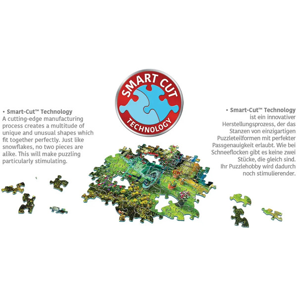 Smart-cut: Tämä uraauurtava valmistusprosessi luo joukon ainutlaatuisia ja epätavallisia muotoja, jotka sopivat täydellisesti yhteen. Aivan kuten lumihiutaleet, ei ole kahta samanlaista palaa. Tämä tekee palapelin kokoamisesta erityisen haastavaa ja stimuloivaa.