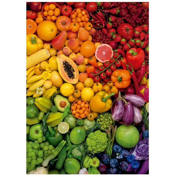 Educa Palapeli 1000 Palaa Colorful Vitamines on erittäin värikäs palapeli. Erivärisiä vihanneksia ja hedelmiä on yhdistetty värikkääksi taideteokseksi.