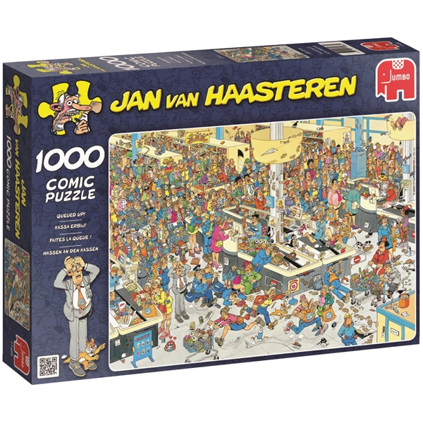 Palapeli 1000 Palaa Queued Up on yksityiskohtainen palapeli aiheenaan todella suosittu supermarketti!Jan Van Haasteren on hollantilainen kuvittaja, joka on tunnettu hänen uskomattoman yksityiskohtaisista, värikkäistä ja eritoten humoristisista kuvituksistaan, varta vasten Jumbolle. Useimmat Janin ihailijat etsivät saman tien hänen tunnusmerkkiään - hainevää, joka esiintyy kaikissa hänen palapeleissään. Myös usein hänen kuvituksissaan esiintyy hänen omakuvansa. Löydätkö sen uudesta palapelistäsi?