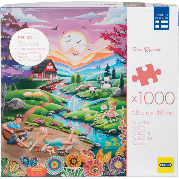 1000 palan palapeli, jossa on romanttinen ja yksityiskohtainen aihe kesän kauniissa värisävyissä, luotu suomalaisen taiteilijan Terttu Raja-ahon toimesta. Poika laulaa laulun tytölleen kauniissa kesämaisemassa auringon laskiessa.