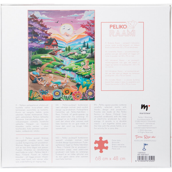 Sisältää Peliko Raami -palapelialustan, joka tekee kuvan rakentamisesta ja kehystämisestä helppoa standardikehykseen, jonka koko on 50 x 70 cm.