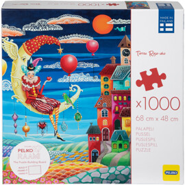 1000 palan palapeli, jossa on viehättävä ja yksityiskohtainen kuva kirkkaissa väreissä, luotu suomalaisen taiteilijan Terttu Raja-ahon toimesta. Uneton pelle istuu kuun päällä jalat heiluen ja omena kädessä.