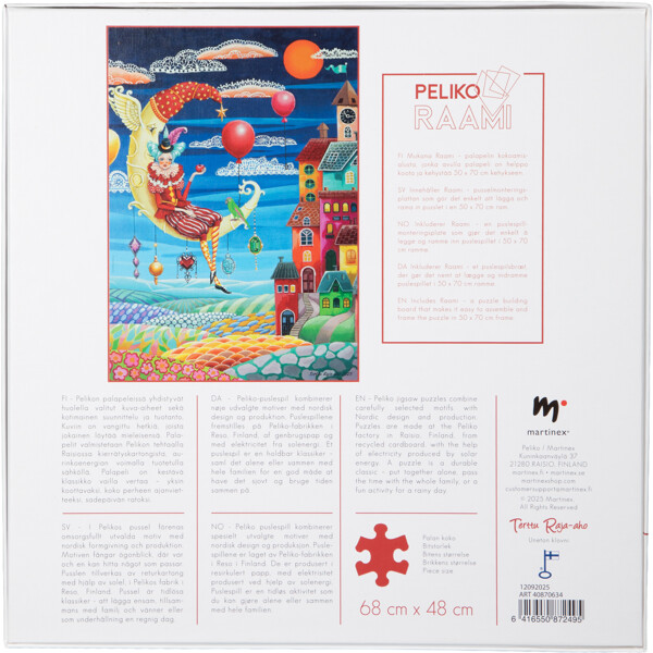 Sisältää Peliko Raami -palapelialustan, joka tekee kuvan rakentamisesta ja kehystämisestä helppoa standardikehykseen, jonka koko on 50 x 70 cm.