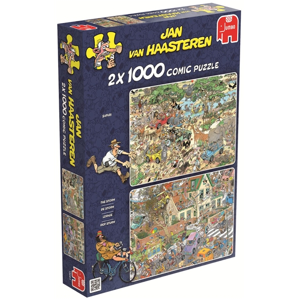 Palapeli 2x1000 Palaa Safari & The Storm on hauska setti sisältäen 2 kpl 1000 palan palapelia Jumbolta, legendaariselta hollantilaiselta palapeliaiheiden luojalta Jan van Haasteren.Safari on mielikuvituksellinen ja humoristinen aihe inspiraationaan safari. Kuten tavallisestikin Janin aiheissa, ei kaikki mene ihan putkeen ilman, että on tapahtuu hauskuuksia siellä ja täällä...The Storm aiheessa on villti myrsky puhaltanut läpi ja aiheuttanut kaikenlaista ongelmaa...Autoja on siellä täällä ja ihmiset saavat taistella etteivät joudu myrskyn viemiksi.Jan Van Haasteren on hollantilainen kuvittaja, tunnettu uskomattoman yksityiskohtaisista, värikkäistä ja eritoten humoristisista kuvituksissta, vain Jumbolle. Useimmat Janin ihailijat etsivät heti hänen tunnusmerkkiään – hainevää, joka on kaikissa häne palapeleissään. Hänen kuvituksissaan näkee myös usein hänen omakuvansa. Löydätkö sen uudesta palapelistäsi?