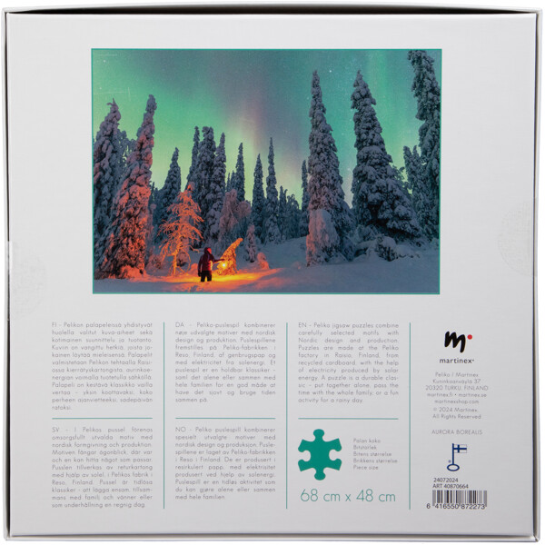 Palapeli on valmistettu kierrätyspahvista ja kootun palapelin koko on 68 x 48 cm.