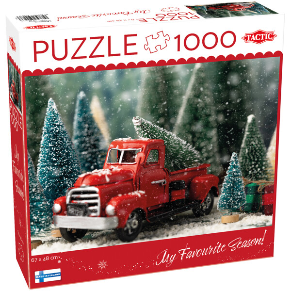 Tactic Palapeli 1000 Palaa Christmas Tree Miniature on jouluinen aihe, jossa on kuorma-auto ja kuusia lumisateessa.