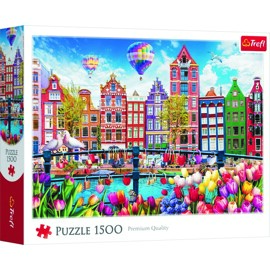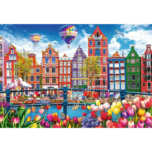 Värikäs Amsterdamin palapeli koostuu 1 500 palasta ja esittää eläväisen panoraaman Amsterdamin kanavataloista, joita ympäröivät tulppaanit, ilmapallot ja koristeet, luoden iloisen ja unenomaisen kaupunkimaiseman.