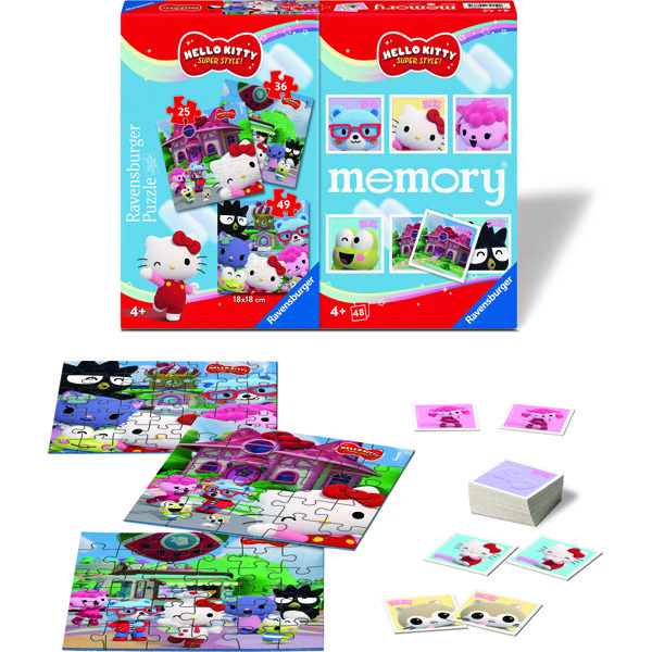 Neljän Ravensburger-klassikon kohtaa Hello Kittyn lumoavan, värikkään maailman: Muistipeli, jossa on 48 rakkaudella suunniteltua korttia, ja kolme värikästä palapeliä, joissa on vaihteleva määrä paloja, takaavat monipuolisen ja hauskan leikkihetken lastenhuoneessa.