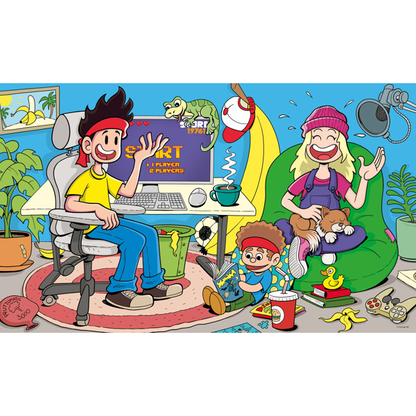 100 palan pahvipalapeli, jossa Yumi & Tomu rentoutuvat näytön edessä.