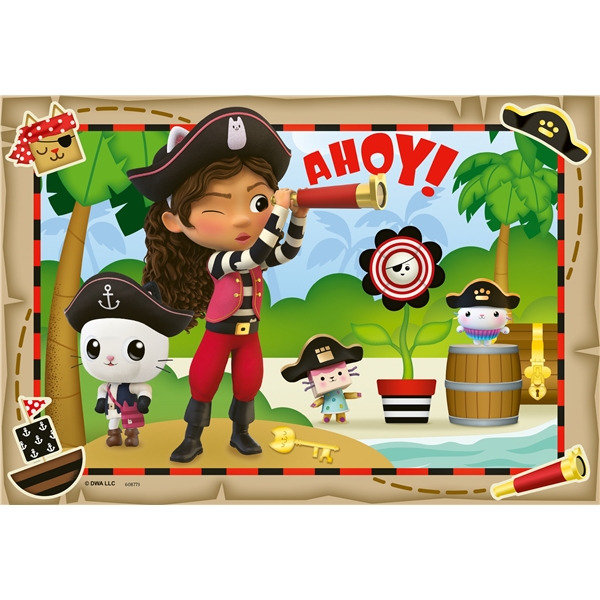 Palapeli 2 x 24 Palaa Gabby's Dollhouse ovat kaksi palapeliä aiheenaan Gabby's Dollhouse ja se sopii lapsille 4 ikävuodesta alkaen. Seuraa Gabbya, hänen somaa kissaansa Pandista ja muita ystäviä merirosvoseikkailuilla. Tai tee palapeli, jossa Gabby askartelee yhdessä ystäviensä kanssa.