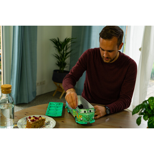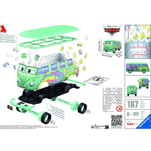 Palapeli 3D 162 palaa Volkswagen T1 Cars Fillmore on vihreä VW-bussi, jossa on sateenkaari, rauhanmerkki ja muita kuvioita. Upea palapeli muodostaen Fillmore 3D-mallin.