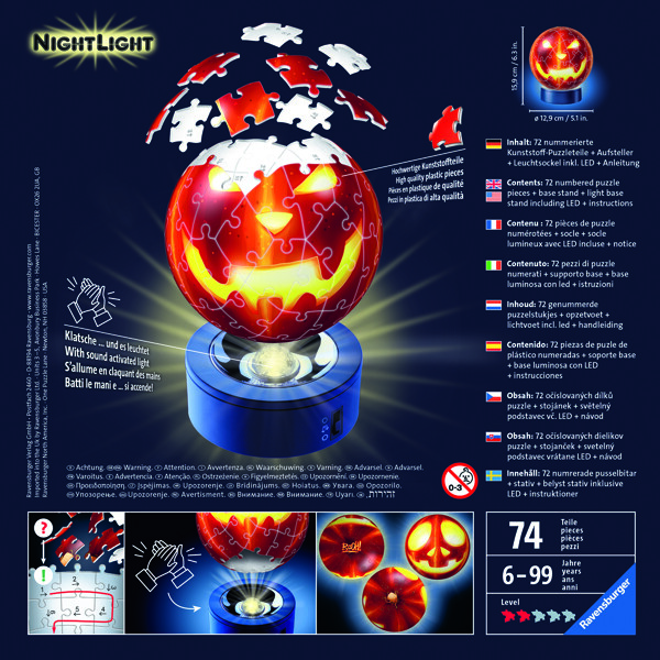 Palapeli 72 Palaa 3D Puzzle-Ball Pumpkin Night Light on huikea 3D-palapeli, jot voi myös käyttää yövalaisimena. Palapelissä on 72 palaa koottavaksi ja ne muodostavat mahtavan kurpitsan. Mukana oleva jalusta sisältää LED-valon, joka valaisee kurpitsan silmien, nenän ja suun kautta luoden kodikasta valoa huoneeseen. Valaisimessa on takana painike ja sytyttäminen/sammuttaminen toimii myös käsiä taputtamalla.